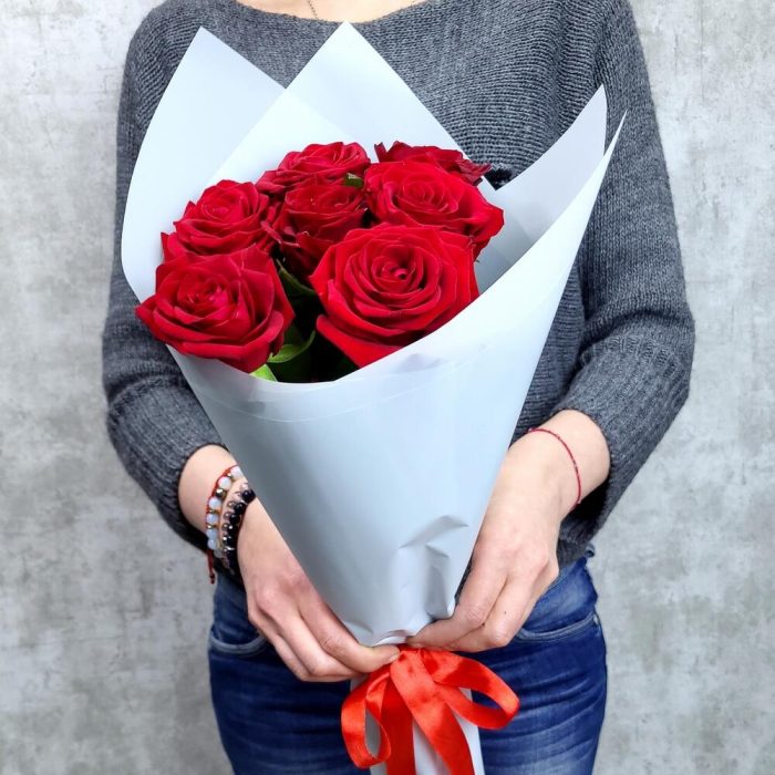 Роза красная 60 см – 7 шт.Упаковка – 1 шт.Лента – 1 шт.