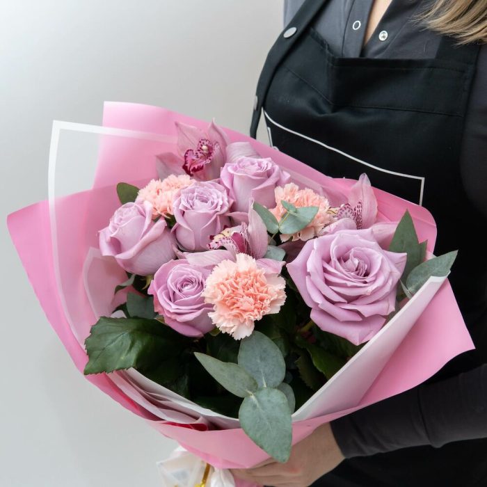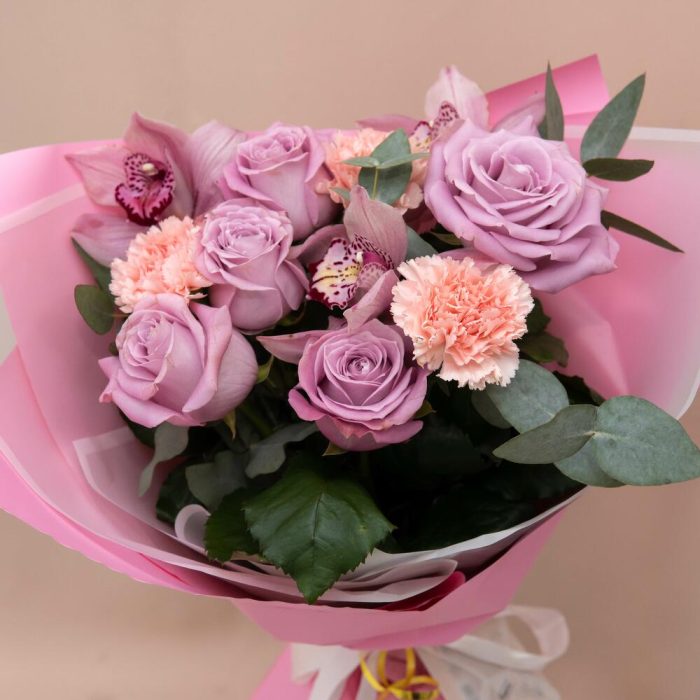 Лента – 1 шт.Эвкалипт – 3 шт.Пленка – 1 шт.Орхидея розовая – 3 шт.Гвоздика персиковая – 3 шт.Роза маритим – 5 шт.