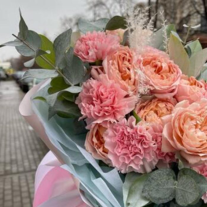 Салал – 5 шт.Тишью – 2 шт.Гвоздика сортовая – 7 шт.Пленка матовая – 2 шт.джульетта роза пионовидная – 3 шт.сухоцветы декоративные микс – 2 шт.эакплипт – 1 шт.