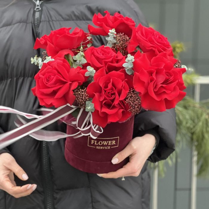 Бархатная коробка с красными французкими розами, эвкалиптом и скиммией!