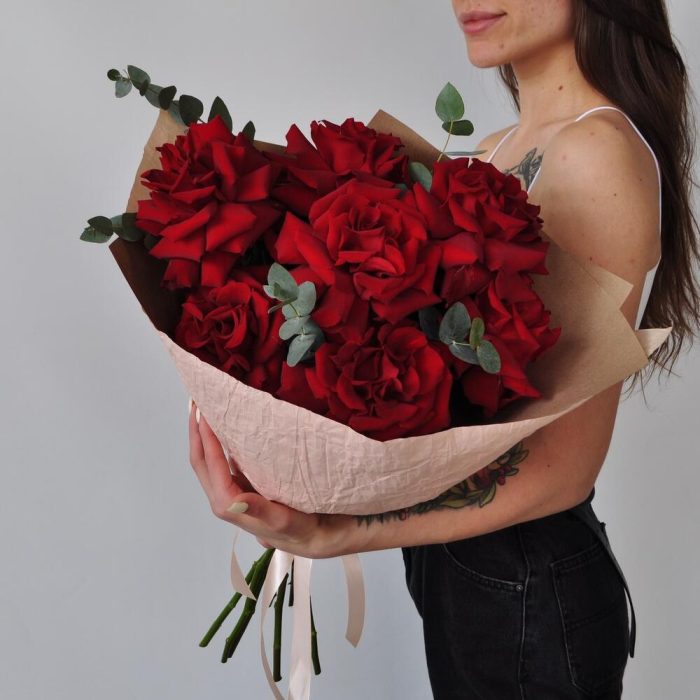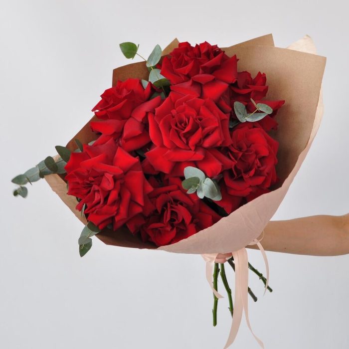 Эвкалипт – 1 шт.Лента атласная – 1 шт.Крафт – 1 шт.Роза французская – 7 шт.Крафт жатый – 1 шт.