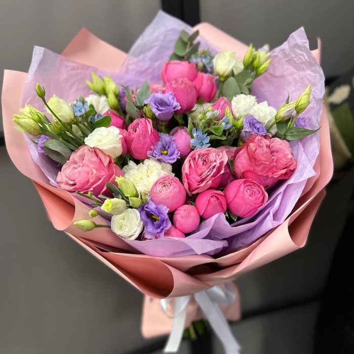 Эвкалипт – 3 шт.Лента атласная – 2 шт.Оксипеталум – 3 шт.Диантус одноголовый – 3 шт.Пленка матовая – 3 шт.эустома розита вайт – 1 шт.роза country blues 50 см – 3 шт.роза кустовая сильва пинк – 4 шт.эустома махровая лавандовая – 2 шт.