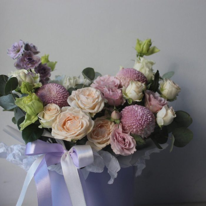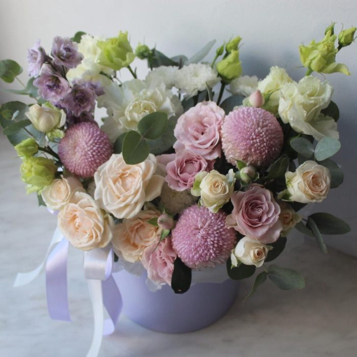 Дельфиниум – 1 шт.Эустома белая махровая – 1 шт.роза кустовая инносенсиа пинк – 1 шт.роза кустовая пионовидная софия – 1 шт.сантини байкал – 2 шт.Хризантема момоко – 3 шт.Диантус белый – 2 шт.Эвкалипт – 2 шт.Коробка шляпная – 1 шт.Тишью белое – 1 шт.Лента атласная – 2 шт.