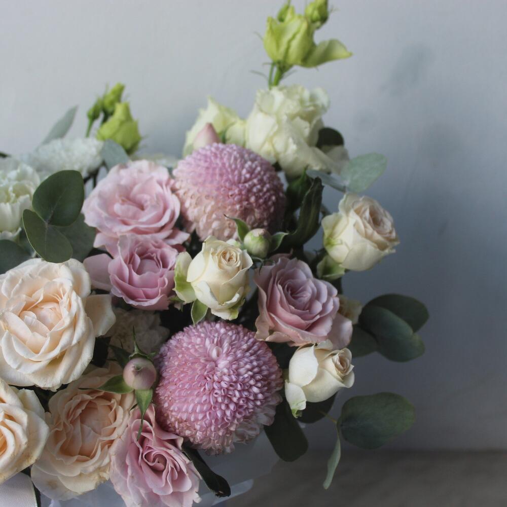 Категорий: Гвоздики, Кустовые розы, Лизиантусы, Пионовидные розы, Розы, Хризантемы