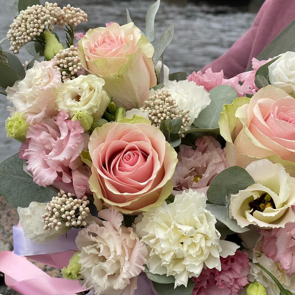 Маттиола – 1 шт.Озотамнус – 2 шт.Эвкалипт – 2 шт.Лента атласная – 2 шт.Диантус – 3 шт.Коробка шляпная – 1 шт.Оазис флористический – 1 шт.эустома розовая махровая – 2 шт.эустома белая – 1 шт.роза эквадор фруттето – 3 шт.