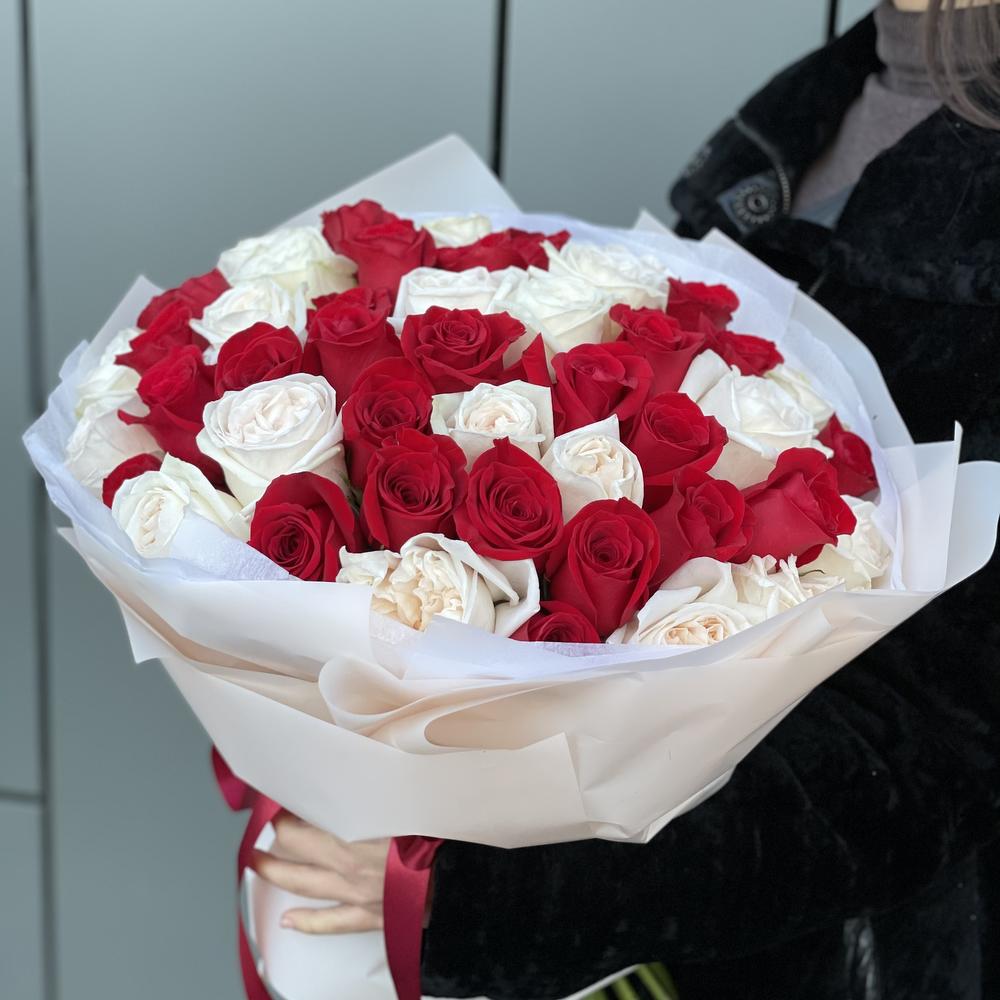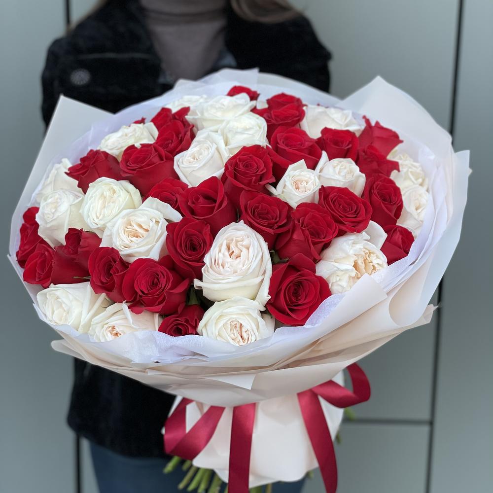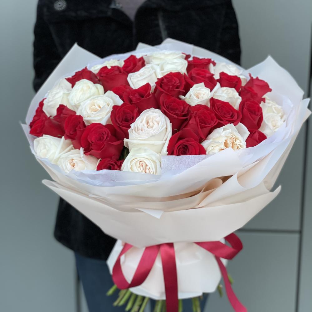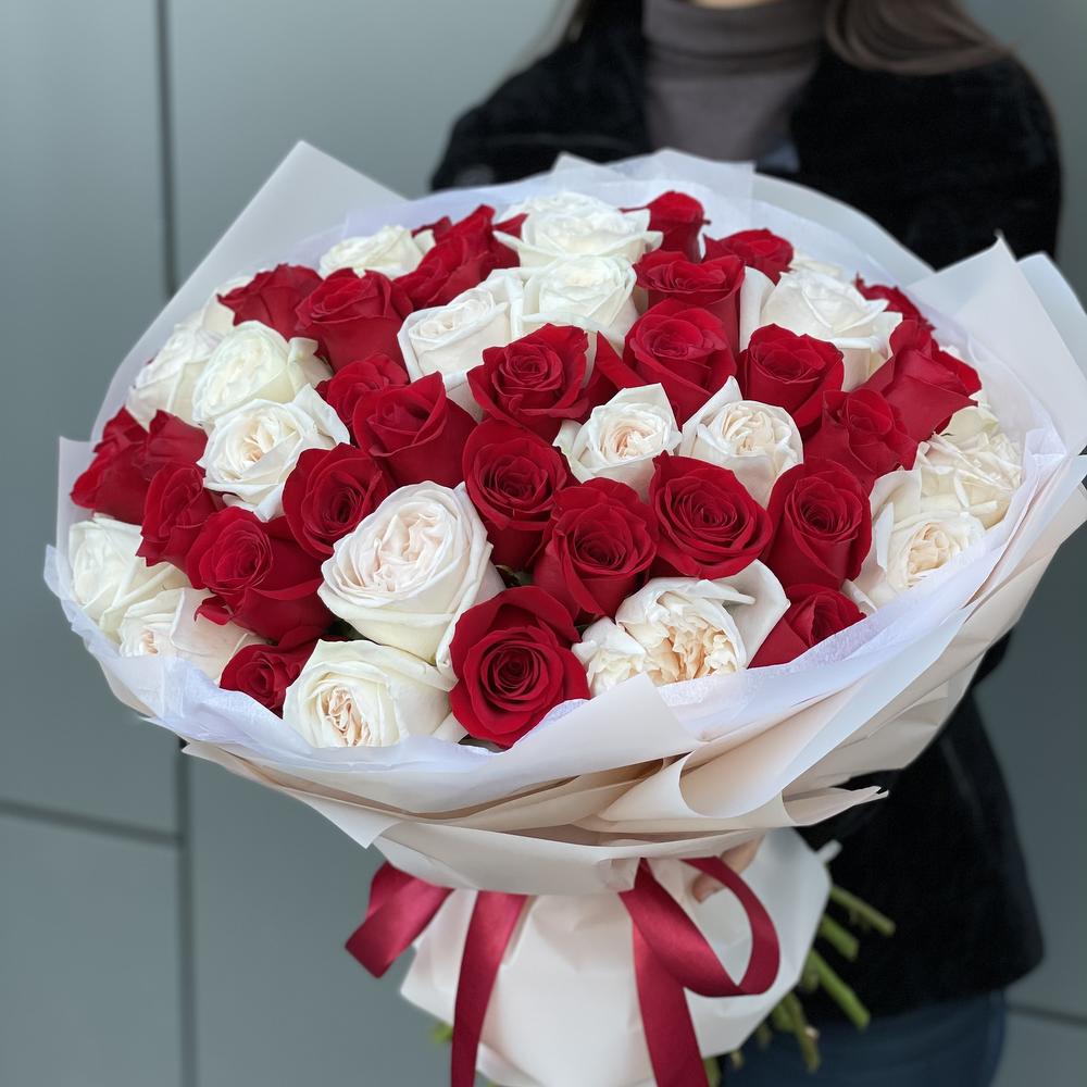 Букет из ароматных пионовидных и красных роз в оформлении!