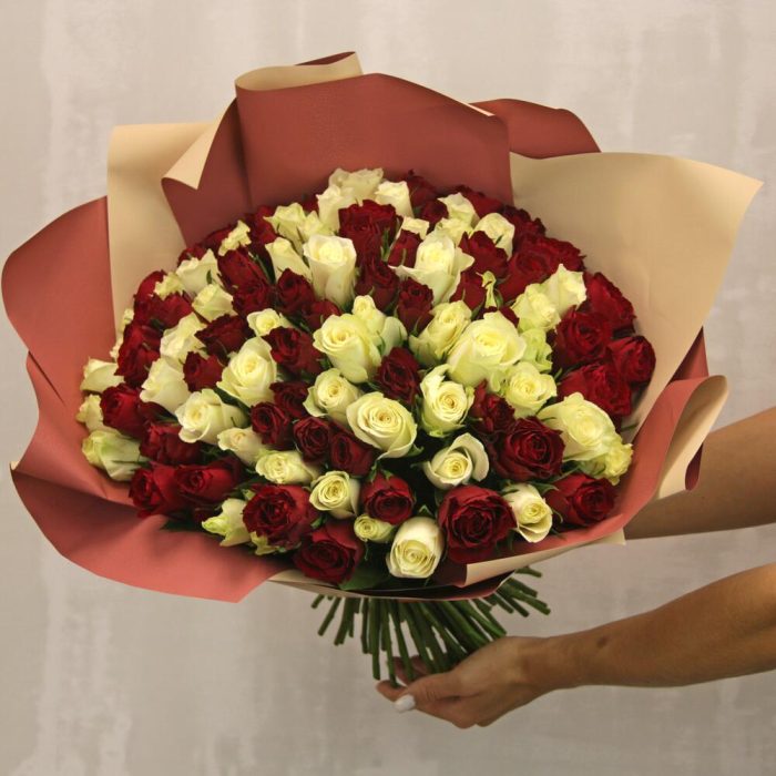 Букет из 101 красной и белой розы микс 35-40 см (Кения) в стильной упаковке