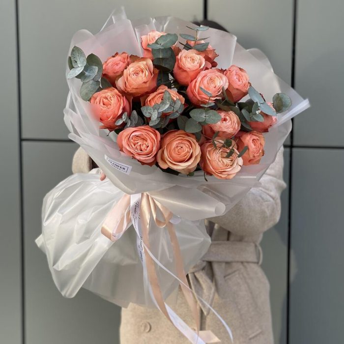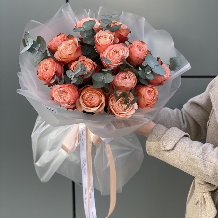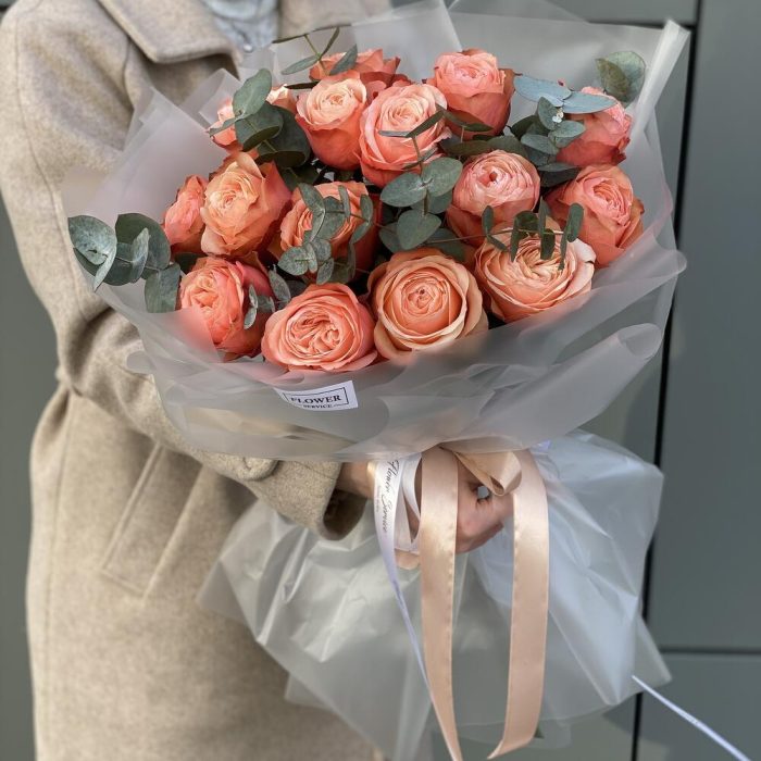 Эвкалипт – 2 шт. Оформление – 1 шт. роза сорта кахала – 15 шт.