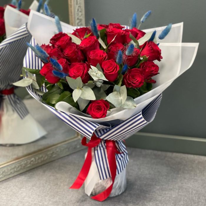 Лента – 1 шт.Эвкалипт – 3 шт.Роза одноголовая – 25 шт.Лагурус (сухоцвет) – 20 шт.бумага упаковочная – 1 шт.