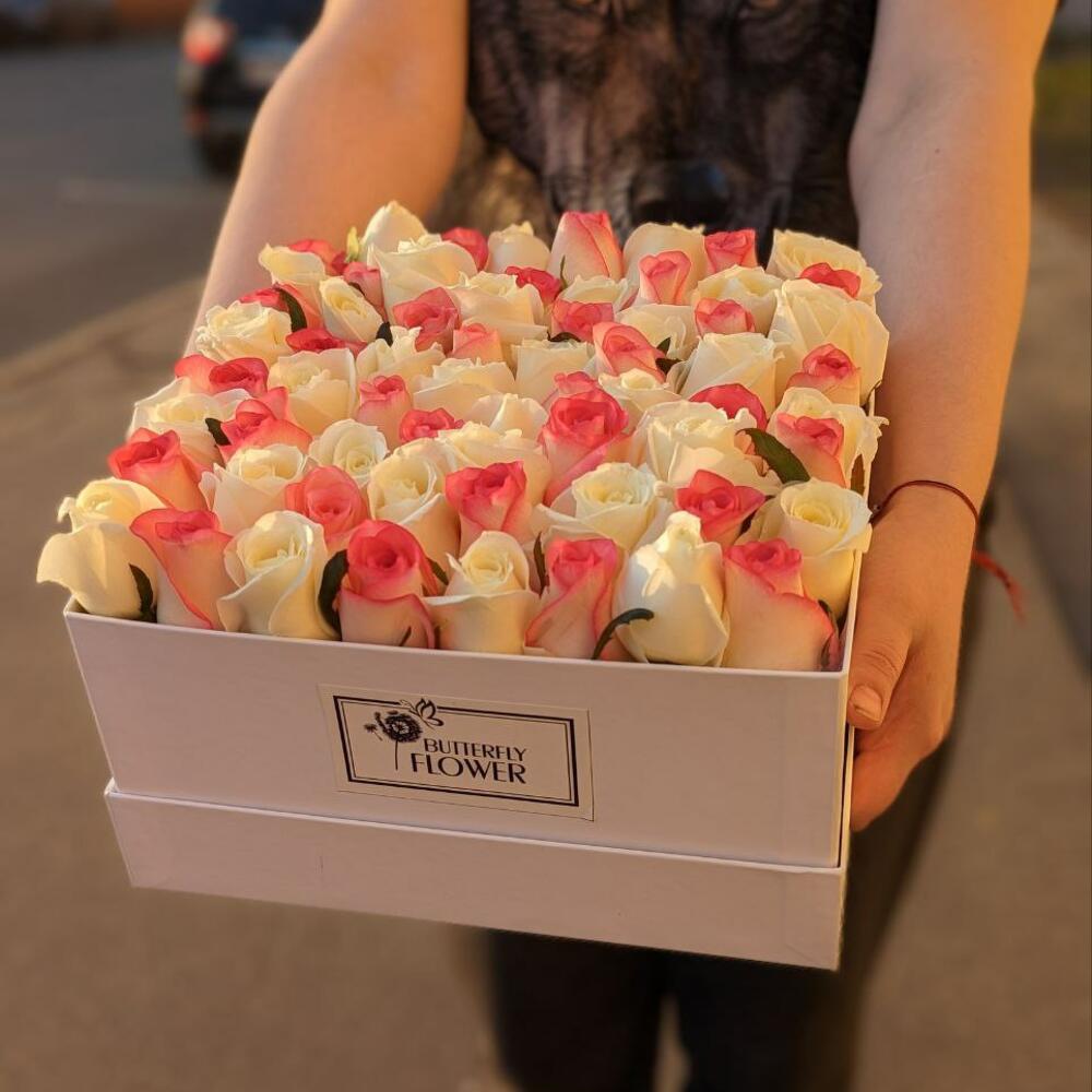 Букет из 65 розовых и белых роз в дизайнерской коробке “Ароматные шахматы”