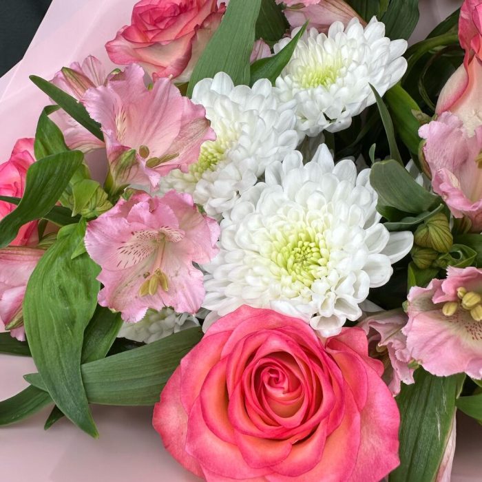 Альстромерия – 3 шт.Хризантема кустовая – 1 шт.Лента атласная – 1 шт.Упаковка дизайнерская – 1 шт.Роза одноголовая эквадор 50 см – 5 шт.