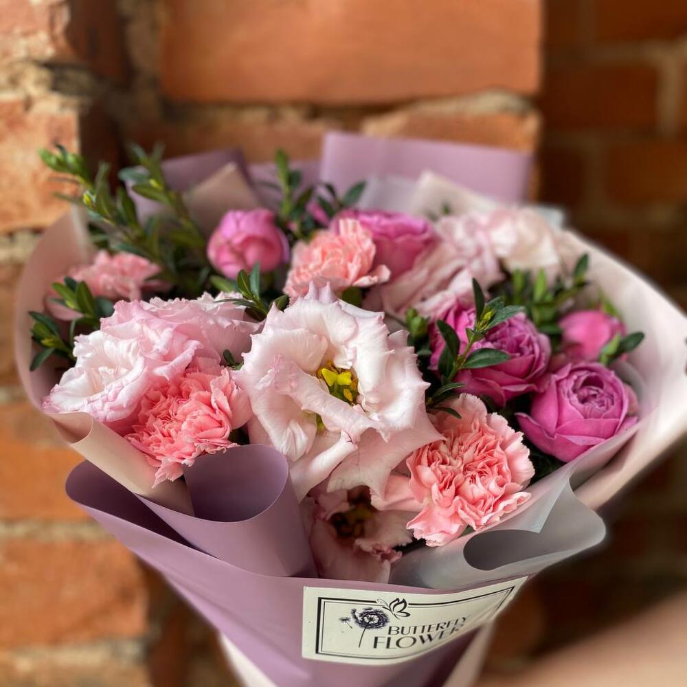 Букет из эустомы, кустовой розы и гвоздики
