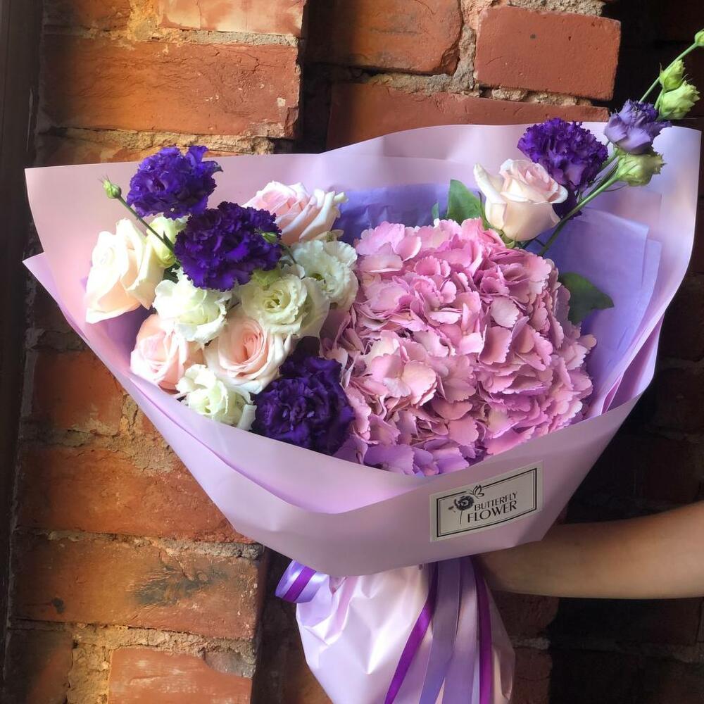 Букет из гортензии, эустомы и роз в стильной упаковке “Свет звезд”