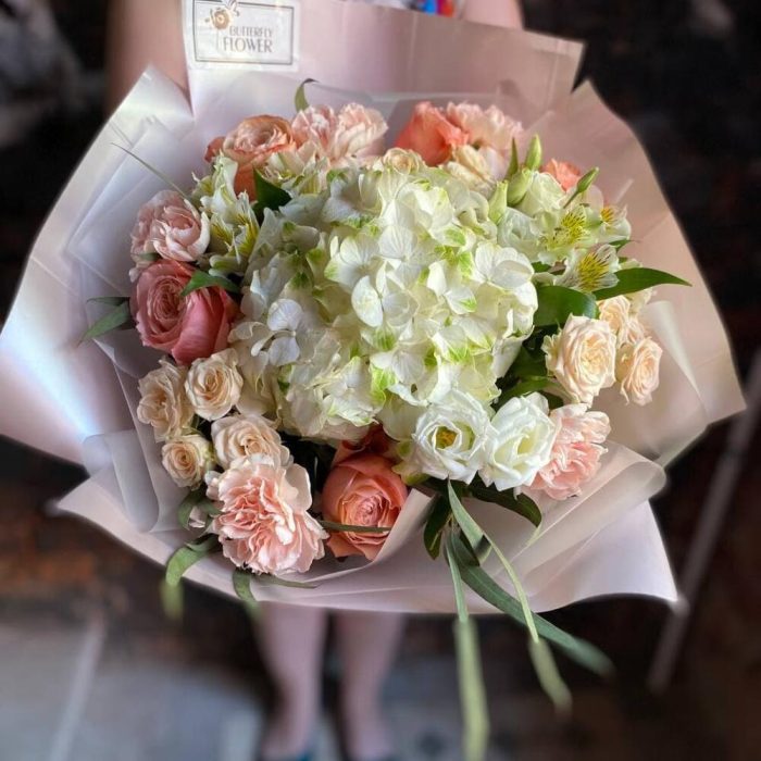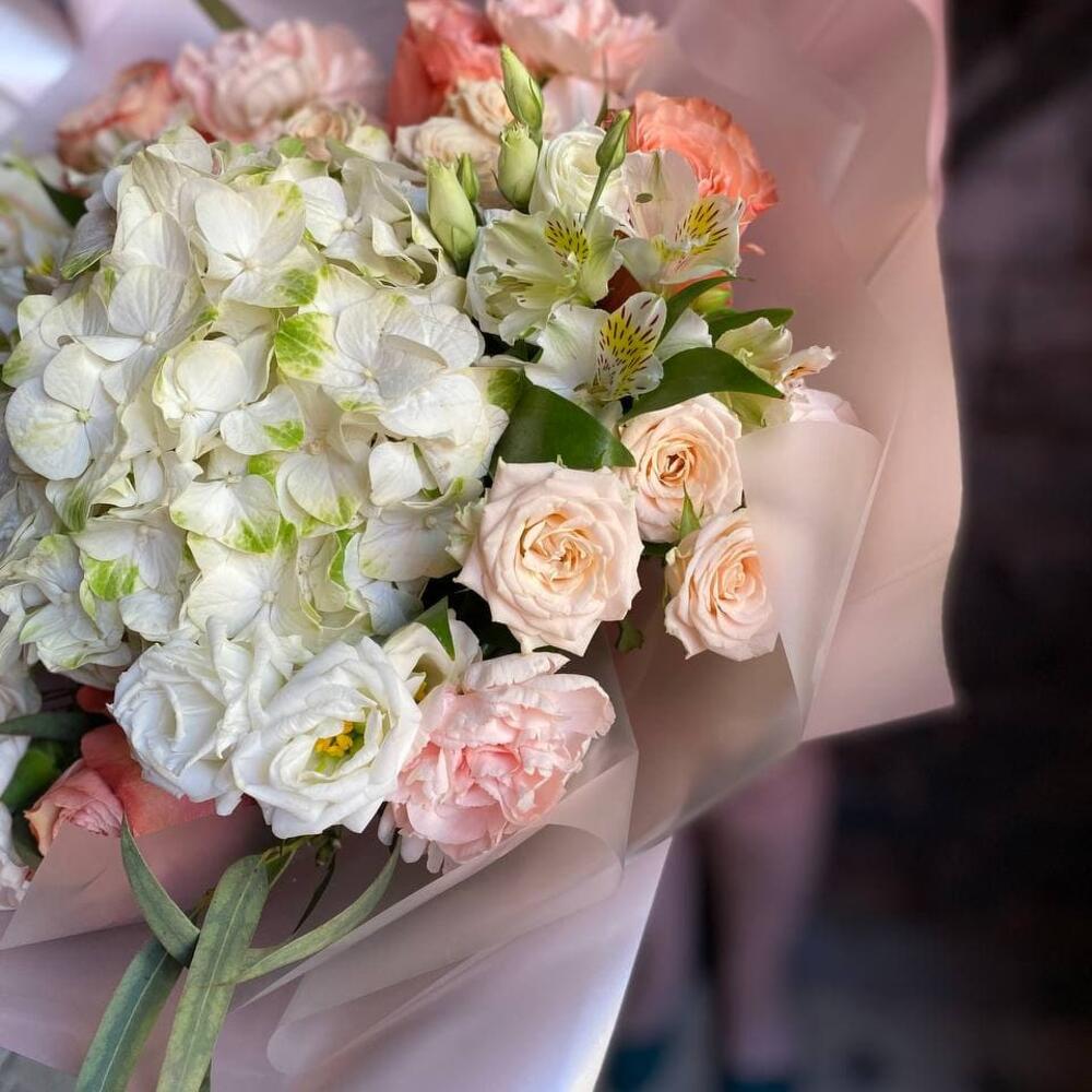 Букет из гортензии, пионовидной розы, эустомы, диантуса, кустовой розы и альстромерии “Летняя нежность”