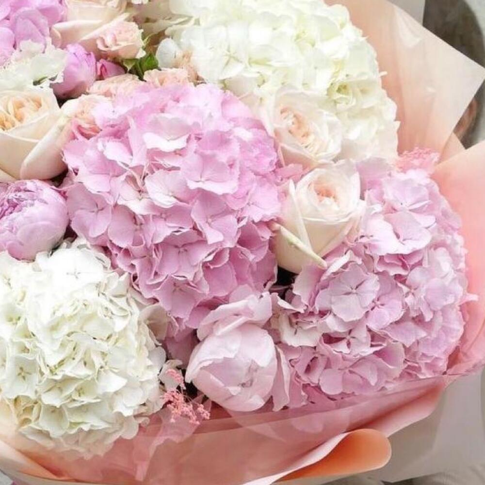 Букет из гортензий, пионов и пионовидных роз «Струны души»