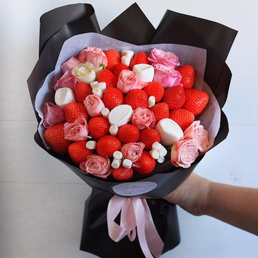 Клубника – 500 гр.Кустовая роза – 3 шт.Маршмеллоу (пачка) – 1 шт.Стильная упаковка – 1 шт.Открытка – 1 шт.Прозрачная пленка – 1 шт.