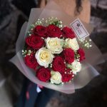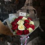 Букет из красных и белых роз с гипсофилой в стильной упаковке “Фолсен”