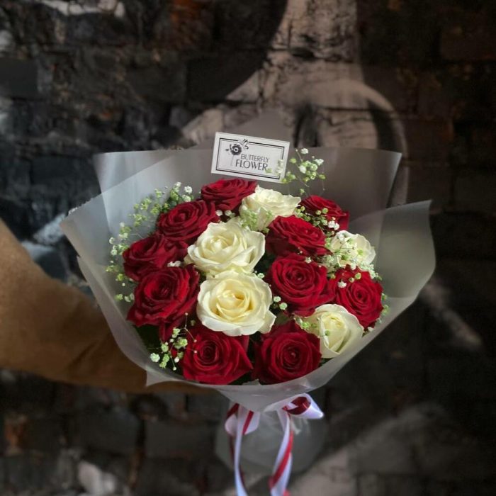 Роза красная – 10 шт.Роза белая – 5 шт.Гипсофила – 2 шт.Упаковка – 2 шт.