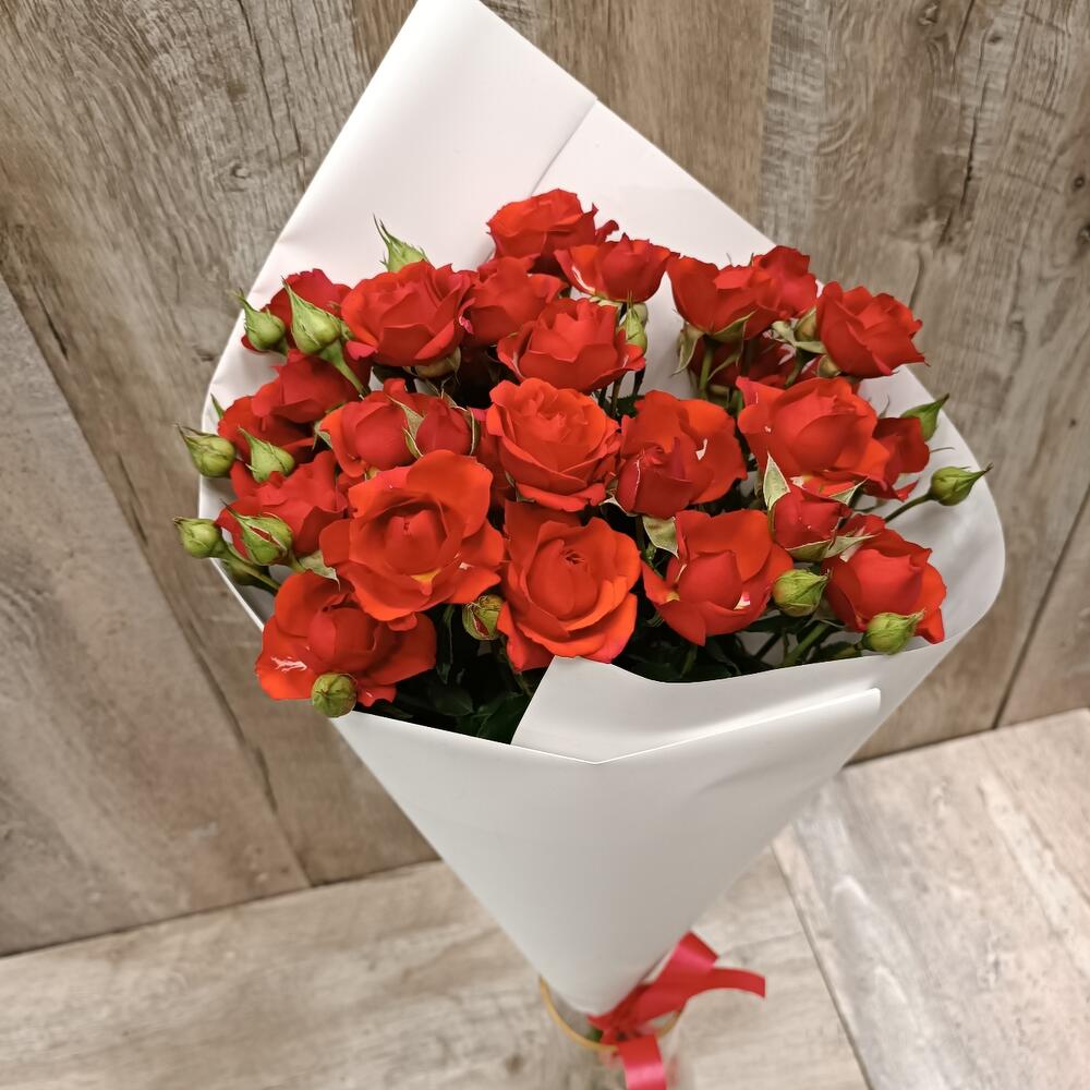 Роза кустовая – 5 шт.Пленка белая – 1 шт.Лента атласная – 1 шт.