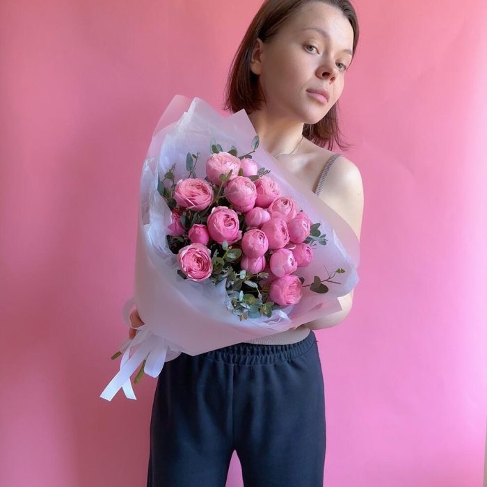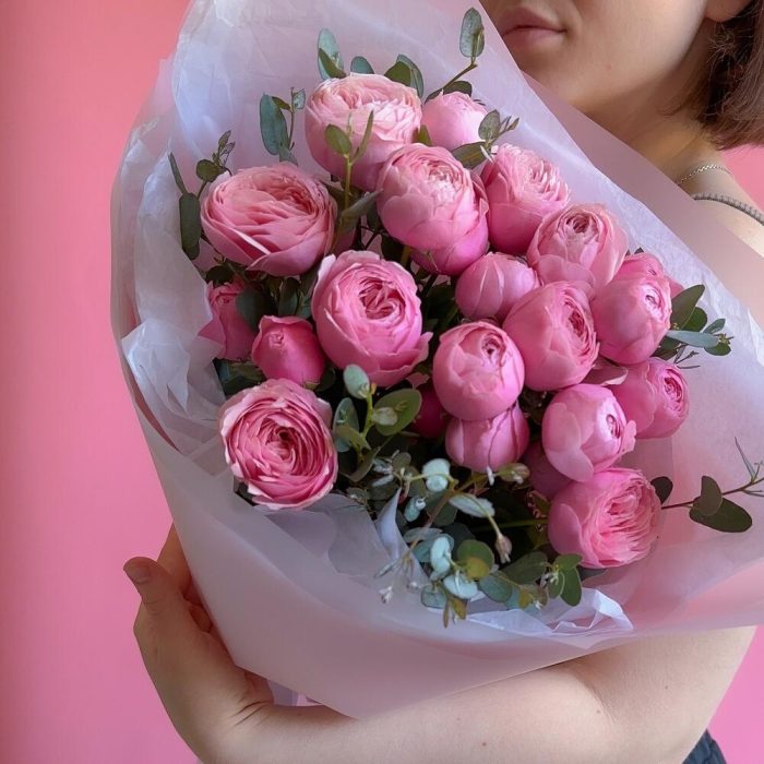 сильвия пинк кустовая пионовидная роза – 5 шт.Эвкалипт – 3 шт.Упаковка дизайнерская – 1 шт.