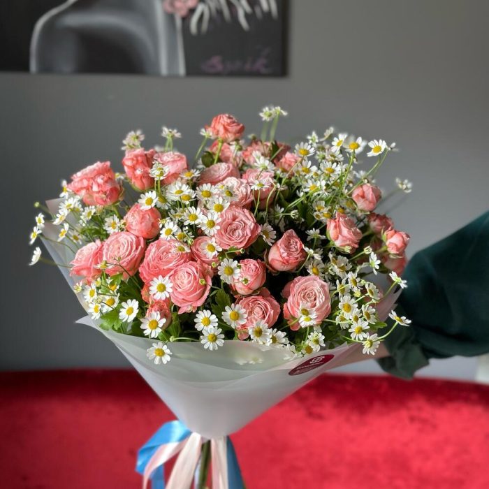 Кустовая роза Бомбастик – 6 шт.Атласная лента – 3 шт.Ромашка матрикария – 5 шт.Дизайнерская упаковка – 1 шт.