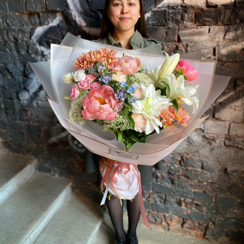 Букет из пионов, трахелиума, кустовых роз, гвоздики, эустомы, твидии, кустовой хризантемы и лилии в стильной упаковке “Офра”