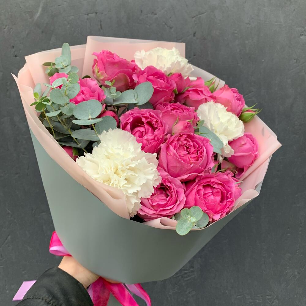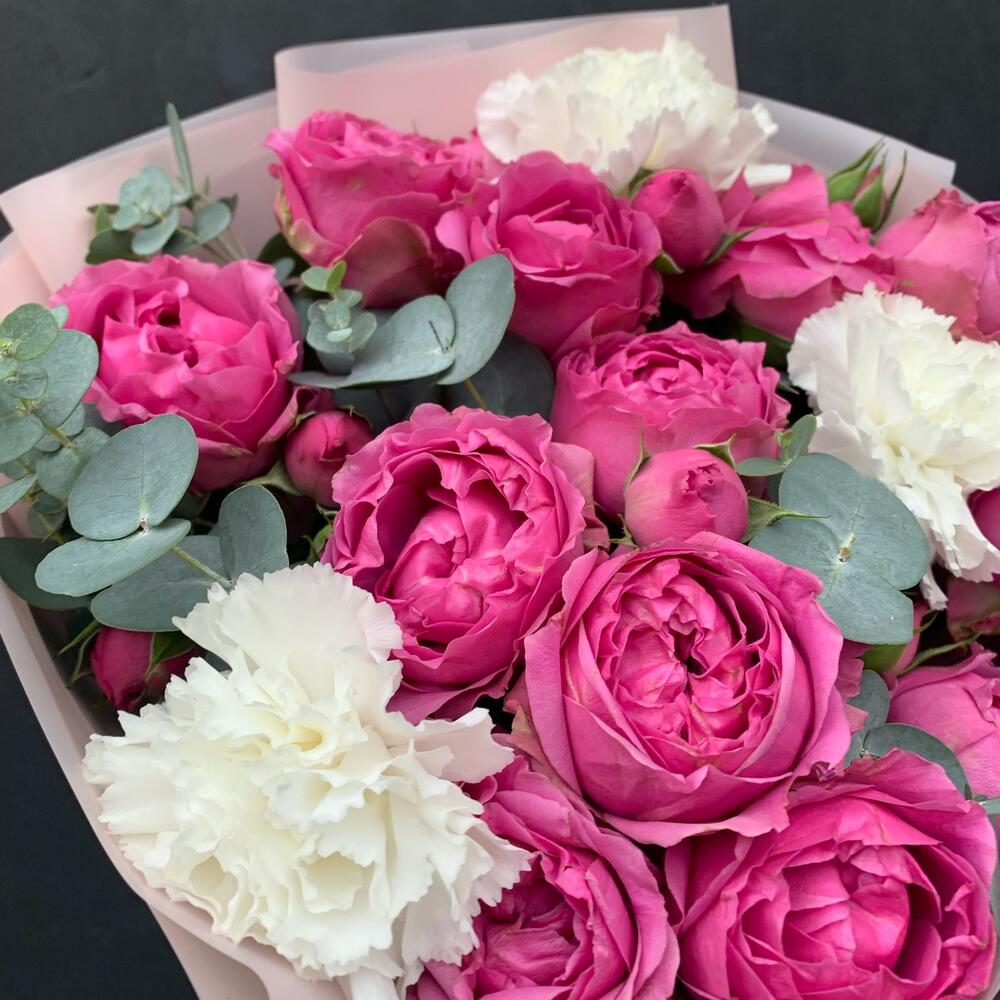 Букет из пионовидных роз,гвоздик и эвкалипта Кэнди