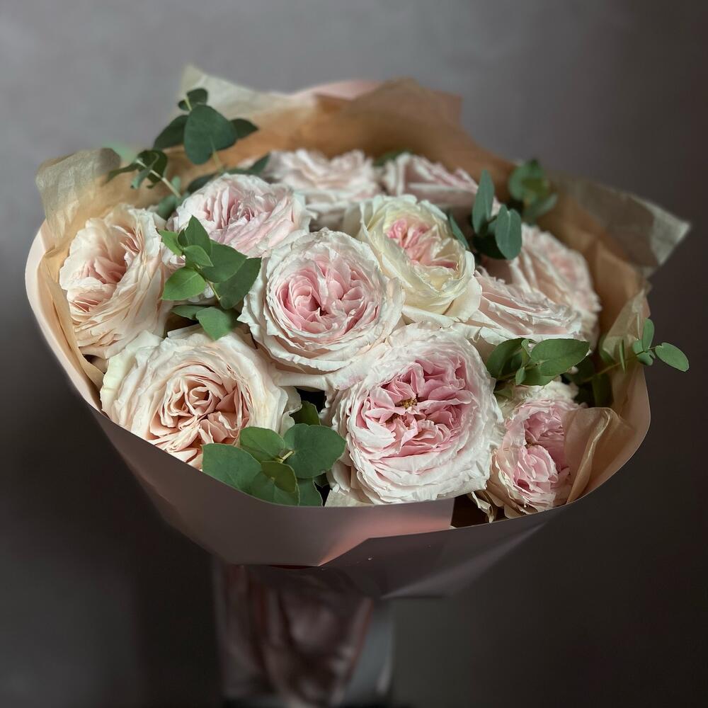 Эвкалипт – 5 шт.Атласная лента – 1 шт.декоративная упаковка – 1 шт.пионовидная роза тсумуги – 11 шт.
