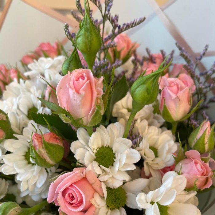 Роза кустовая – 7 шт.Хризантема кустовая – 6 шт.Лимониум – 3 шт.Упаковка дизайнерская – 3 шт.