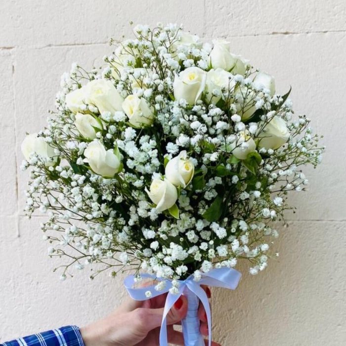 Роза кустовая – 5 шт.Гипсофила – 3 шт.Лента атласная – 1 шт.