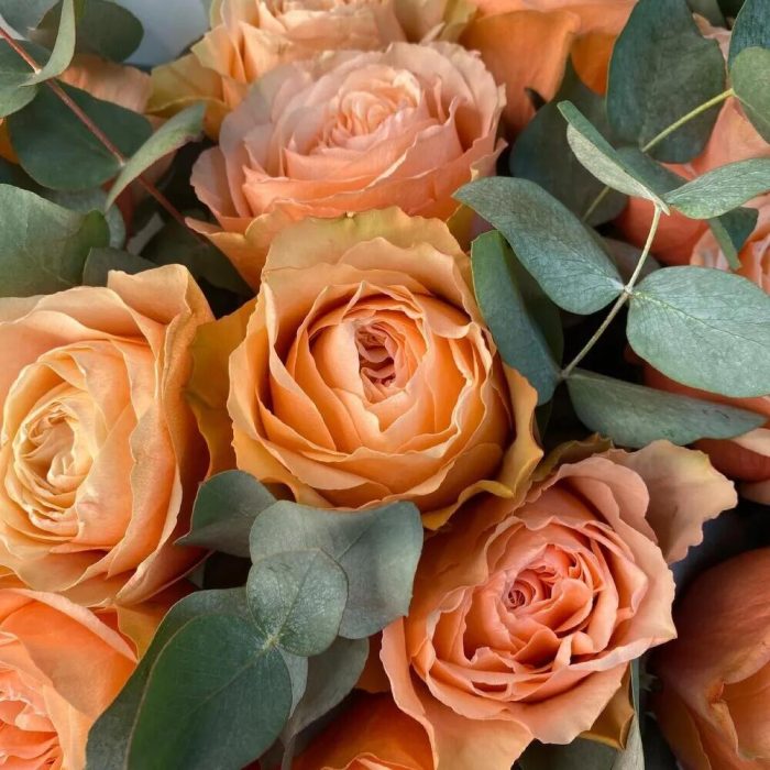 Эвкалипт – 7 шт.Роза Эквадор – 15 шт.Лента атласная – 1 шт.Упаковка дизайнерская – 5 шт.