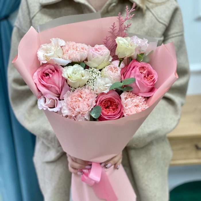 Озотамнус – 1 шт.Гвоздика сортовая – 3 шт.эустома розовая – 1 шт.Конифер – 1 шт.роза пионовидная пинк экспрешн – 3 шт.менсфилд парк кустовая пионовидная – 1 шт.эвкалипт 50 – 4 шт.