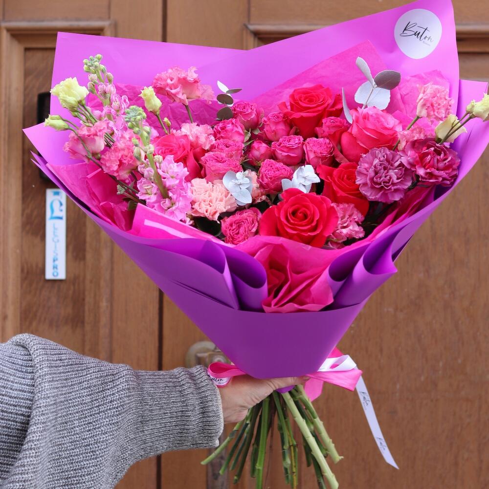 Букет премиум “Малиновый рай” с пионовидными розами, лизиантусом и маттиолой