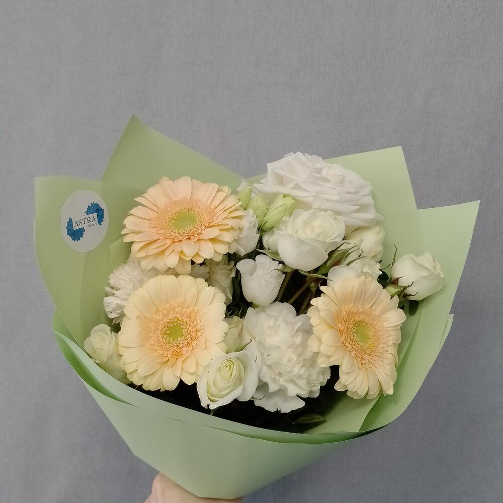 Гербера – 3 шт.роза плая бланка – 1 шт.куст роза – 2 шт.Диантус – 2 шт.Лизиантус – 1 шт.