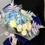 Кустовая роза – 1 шт.Лента атласная – 1 шт.Гортензия голубая – 1 шт.Лента органза – 1 шт.Роза Мондиаль Эквадор – 4 шт.Листья папоротника – 4 шт.Пленка дизайнерская – 2 шт.