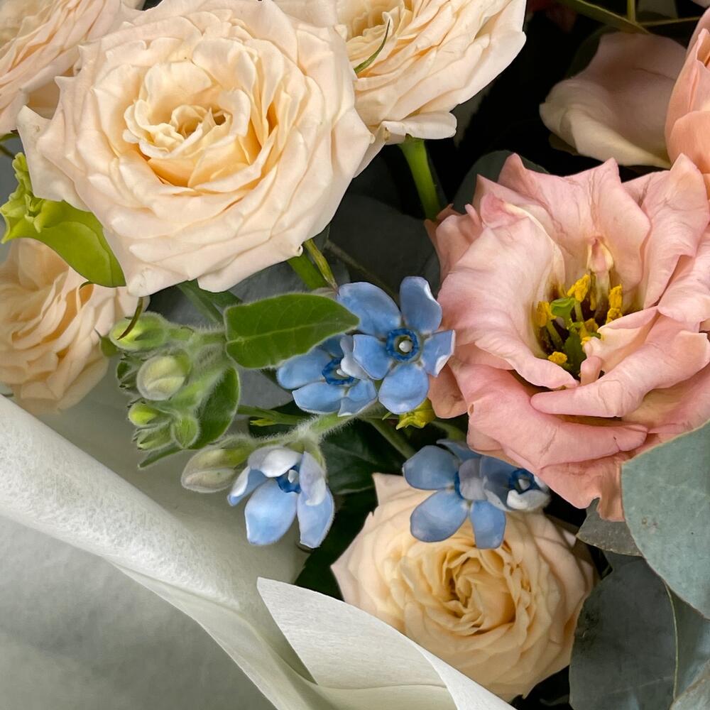 Лента – 2 шт.Лизиантус – 1 шт.Роза кустовая – 3 шт.Эвкалипт – 2 шт.Роза одноголовая – 2 шт.Упаковка – 1 шт.Гвоздика – 3 шт.Оксипеталум – 2 шт.