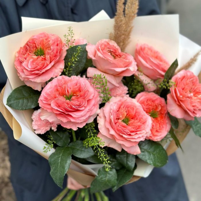 роза мандарин экспрешен – 7 шт.Диантус – 5 шт.Гринбелл – 2 шт.Упаковка дизайнерская – 1 шт.Сухоцветы – 1 шт.