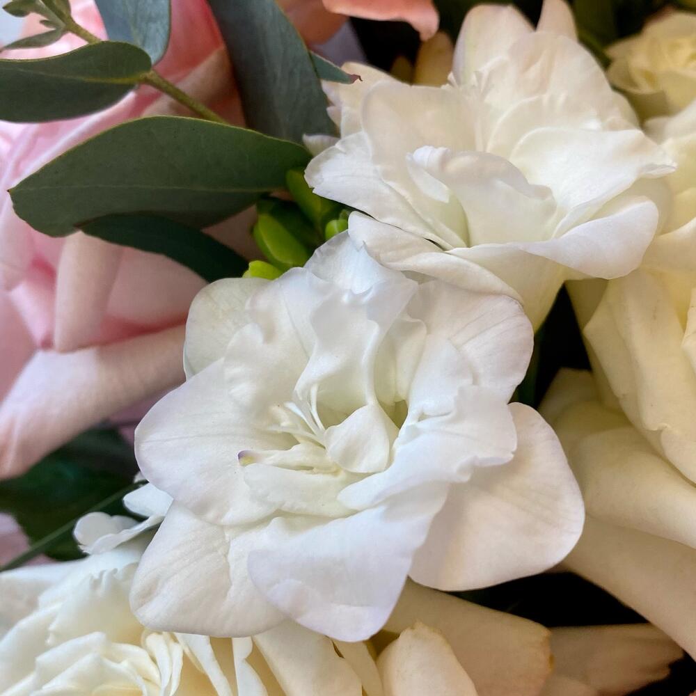 pink o’hara роза – 4 шт.плая бланка роза – 2 шт.Диантус розовый – 3 шт.Кустовая роза – 1 шт.Фрезия белая – 2 шт.Эустома алиса – 1 шт.Эвкалипт – 4 шт.Упаковка дизайнерская – 4 шт.Лента атласная – 2 шт.
