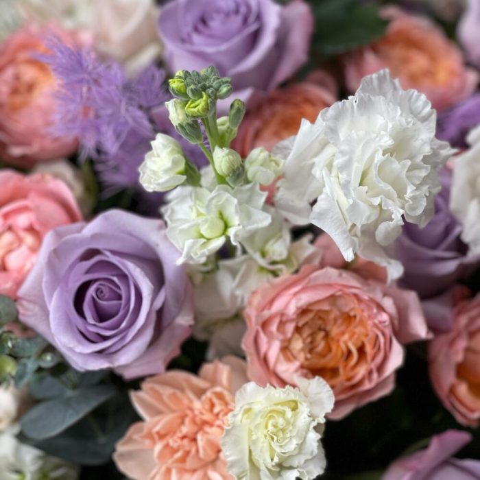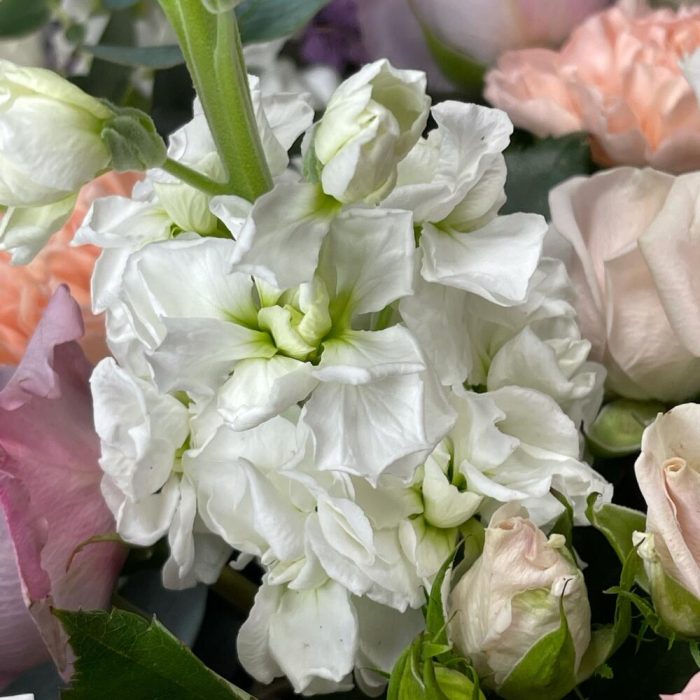 Гипсофила – 3 шт.Лаванда – 10 шт.Лента – 3 шт.Лизиантус – 10 шт.Маттиола – 8 шт.Эвкалипт – 3 шт.Роза одноголовая – 11 шт.Коробка шляпная – 1 шт.Аспарагус – 1 шт.Фисташка – 3 шт.Роза кустовая пионовидная – 5 шт.Оазис флористический – 1 шт.Гвоздика одноголовая – 11 шт.