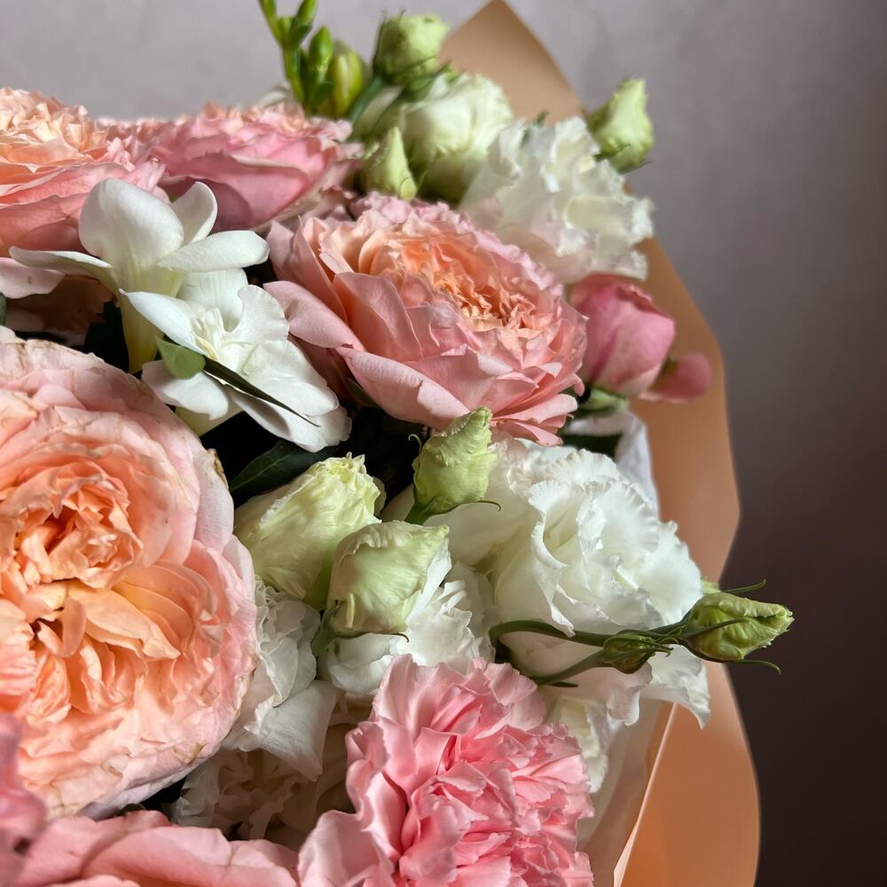 Пионовидная кустовая роза – 2 шт.Лизиантус (эустома) – 3 шт.Фрезия – 3 шт.Диантус – 5 шт.Фисташка – 3 шт.декоративная упаковка – 1 шт.Атласная лента – 1 шт.