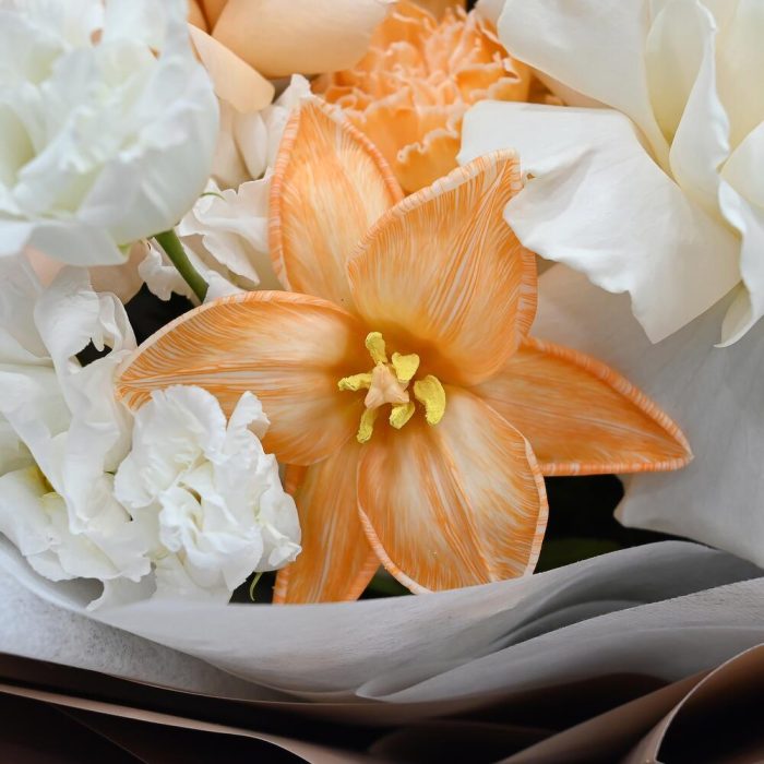 Пионовидная роза – 2 шт.Эустома – 1 шт.Гвоздика – 3 шт.Тюльпан – 1 шт.Рускус – 2 шт.Магнолия – 2 шт.Роза – 1 шт.Упаковка дизайнерская – 1 шт.Лента атласная – 1 шт.