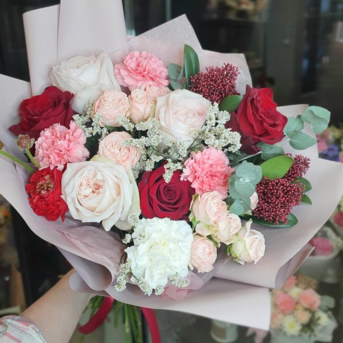 Роза кустовая пионовидная – 2 шт.Роза пионовидная – 3 шт.Роза – 3 шт.Эвкалипт пучок – 1 шт.диантос – 4 шт.Лимониум – 2 шт.Скиммия пучок – 1 шт.Ранункулюс – 1 шт.Упаковка дизайнерская – 2 шт.