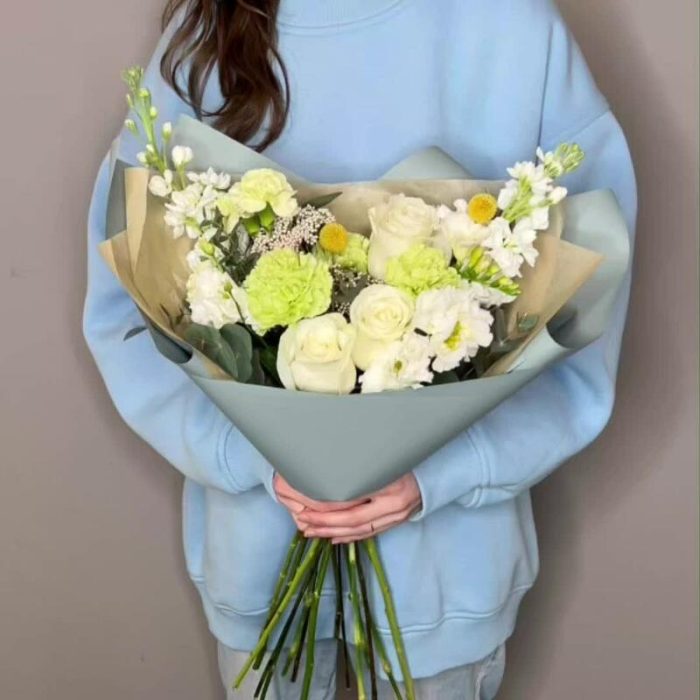 Букет в бело-зелёных оттенках с матиолой и белой розой