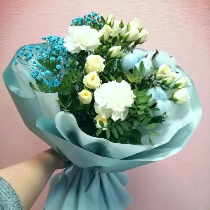 Гипсофила – 1 шт.Роза кустовая – 3 шт.Упаковка – 2 шт.Диантус – 3 шт.Фисташка – 3 шт.Хлопок натуральный – 3 шт.