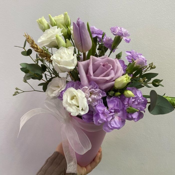 Роза – 1 шт.Эустома – 3 шт.Гвоздика кустовая – 2 шт.Сухоцветы – 1 шт.Эвкалипт – 3 шт.Стакан – 1 шт.Оазис флористический – 1 шт.Лента атласная – 1 шт.