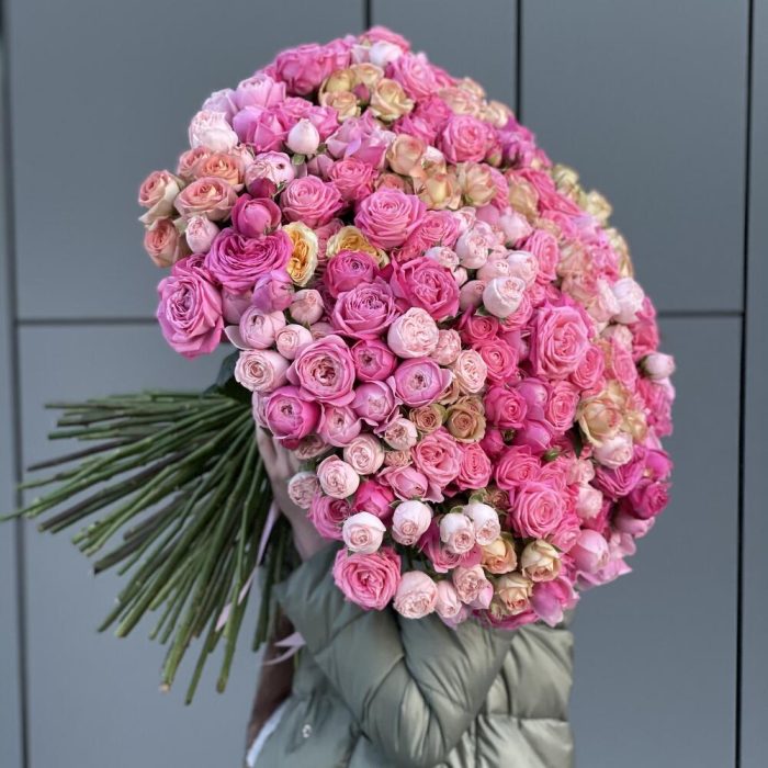 Кустовая роза – 101 шт. оформление – ленты – 1 шт.