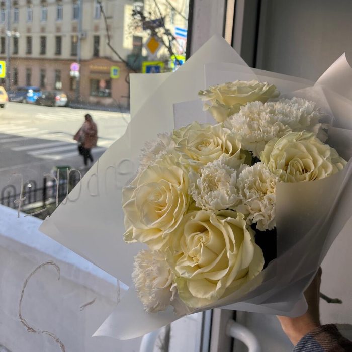 Диантус – 6 шт.Роза мондиаль 50 см – 5 шт.Упаковка дизайнерская – 1 шт.