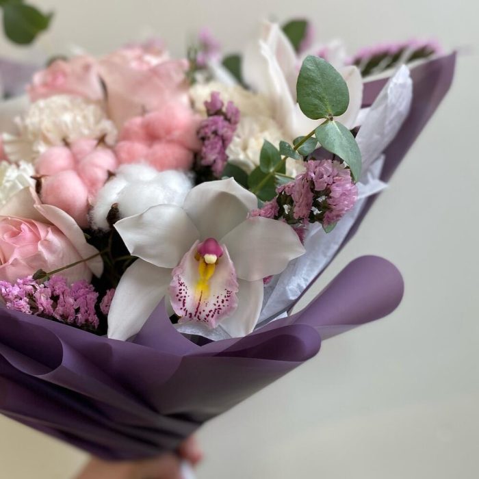 Орхидея Цимбидиум – 5 шт.Статица – 6 шт.Эвкалипт – 4 шт.Роза Эквадор – 5 шт.Лента атласная – 5 шт.Фисташка – 5 шт.Упаковка дизайнерская – 9 шт.Хлопок натуральный – 4 шт.Диантус сортовой – 5 шт.