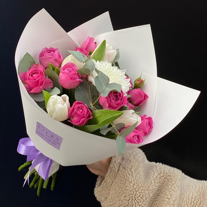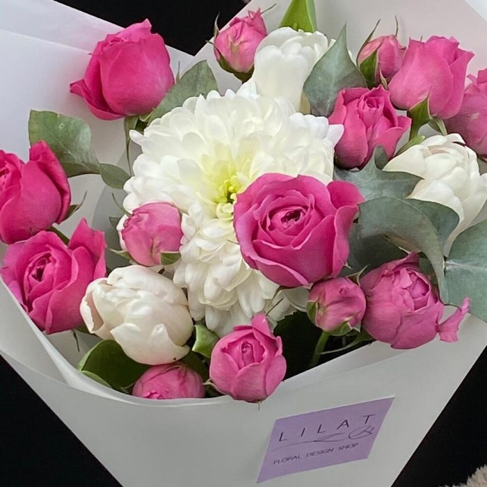 Альстромерии, Кустовые розы, Лизиантусы, Пионовидные розы, Розы, Ромашки