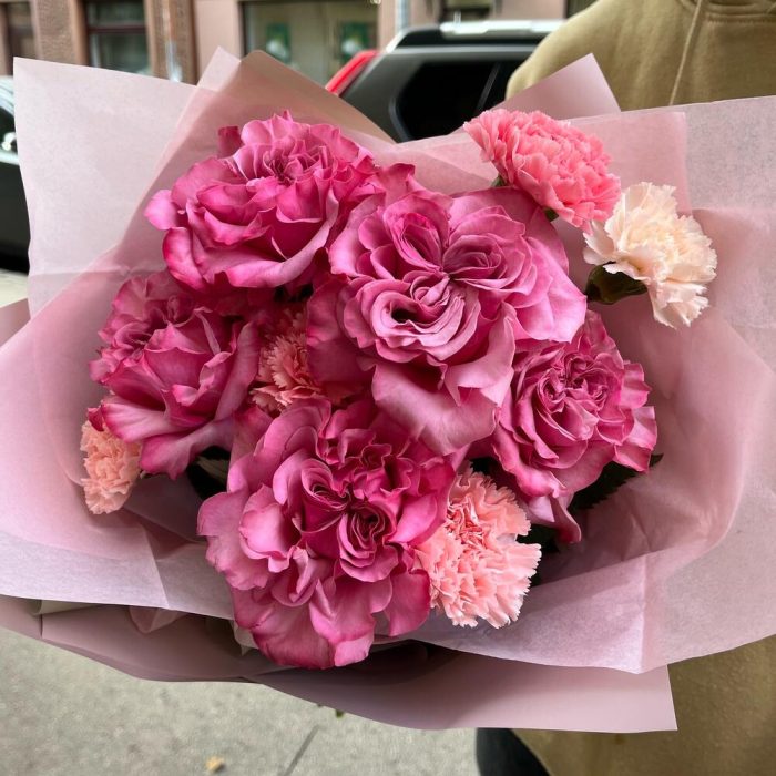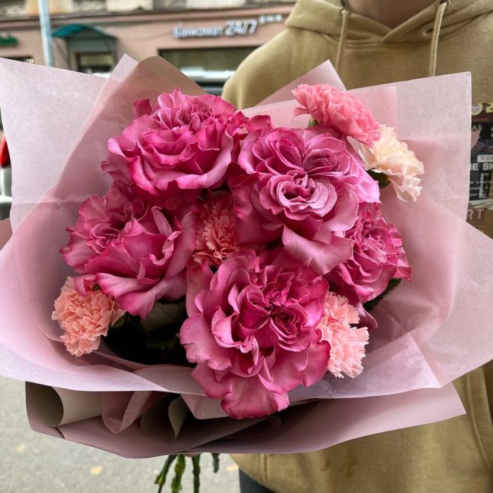 роза пионовидная кантри блю – 5 шт.диантус розовый микс – 6 шт.Упаковка дизайнерская – 2 шт.
